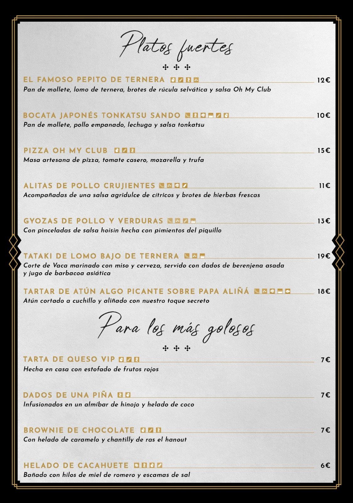 Adjunto la Carta de Cenas Oh My Club, los precios de todos los platos, incluyen entrada en la Discoteca Oh My Club para los asistentes, hasta un maximo de 4 por mesa (Normativa COVID).